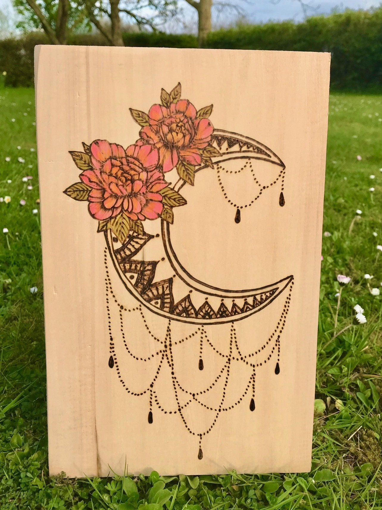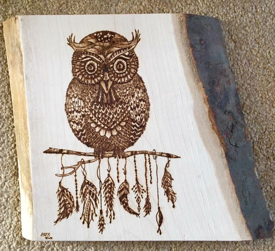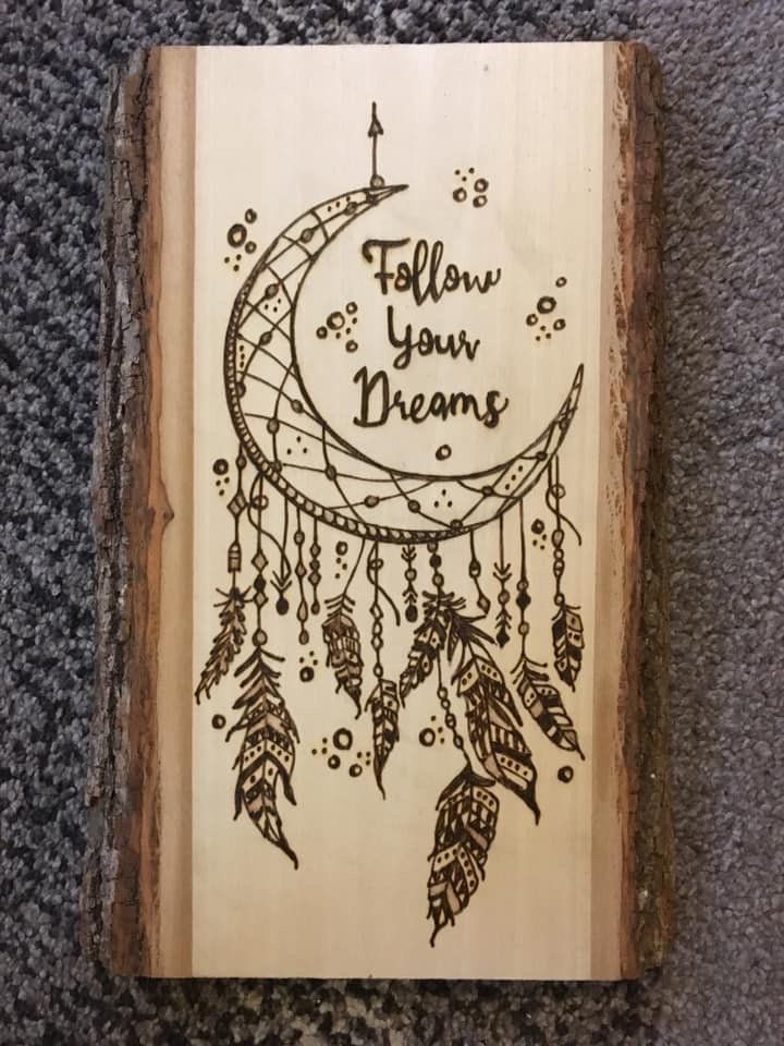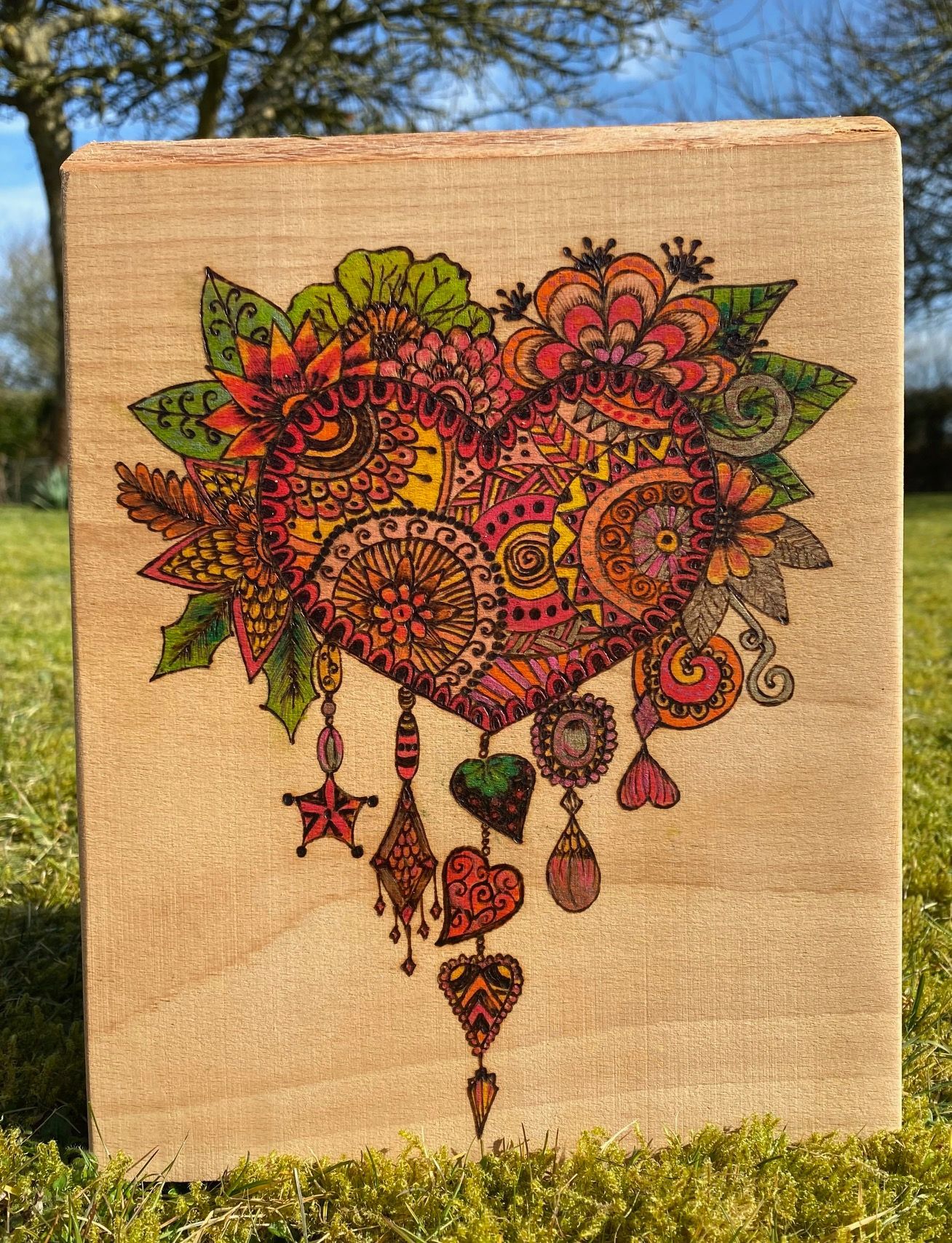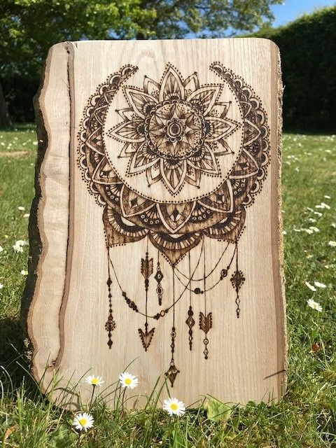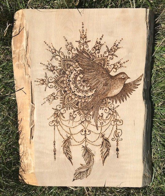 The images below are all hand drawn on to the individual piece of wood first and then the details are burnt in using the pyrography 'pen' creating a unique piece of art.